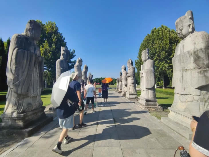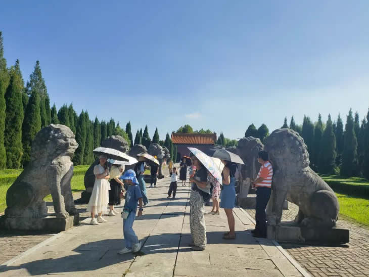 中午,大家在農(nóng)家樂品嘗了當(dāng)?shù)靥厣↓埼r,隨后坐車前往第二站明祖陵。這里被譽(yù)為全國唯一一座水下皇陵,承載了朱明興衰的塵煙。工匠與家屬們漫步在陵墓神道之上,在講解聲中觀察幾百年前的石刻群像,體會其中的歷史余韻與時代遺音。石像歷經(jīng)幾百年時光仍然細(xì)節(jié)豐富、栩栩如生,然而六朝舊事隨流水,百年帝業(yè)亦成空。