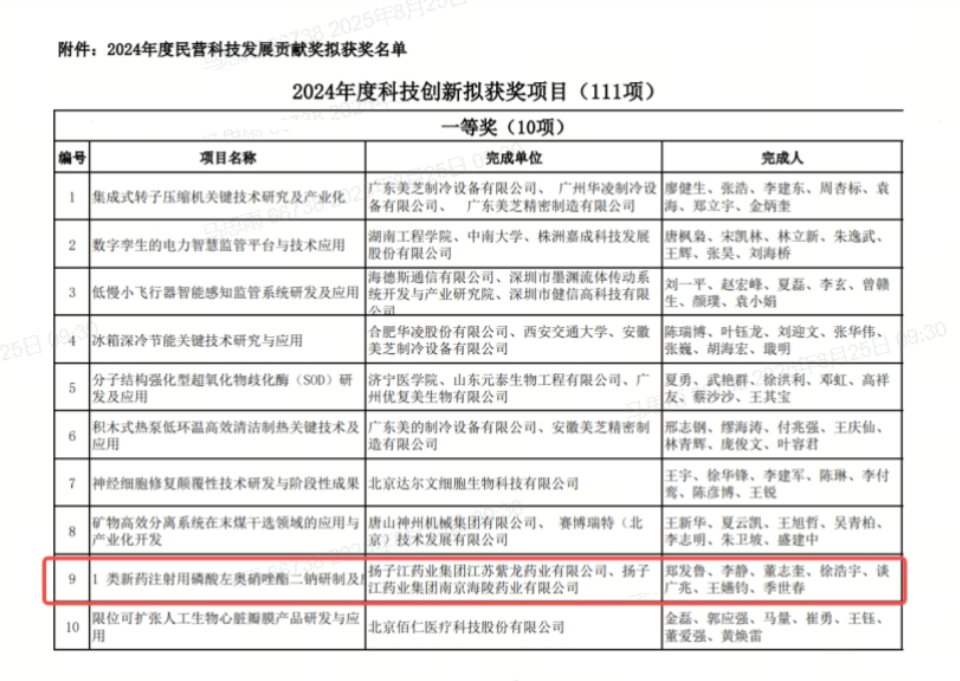 中國民營科技促進(jìn)會(國家民政部和國家科學(xué)技術(shù)部直管單位)公布"2024年度中國民營科技發(fā)展貢獻(xiàn)獎"評審結(jié)果。此次由江蘇紫龍藥業(yè)有限公司、南京海陵藥業(yè)有限公司、南京研究院以"產(chǎn)研結(jié)合方式"三方聯(lián)合申報,憑借自主研發(fā)的化學(xué)1類新藥一"注射用磷酸左奧硝唑酯二鈉"(簡稱-商品名:新銳)的首創(chuàng)綠色工藝和較好的臨床治療價值,榮膺一等獎。本年度貢獻(xiàn)獎共評出科技創(chuàng)新獎111項(一等獎10項,二等獎38項,三等獎63項),"新銳"是唯一一項化學(xué)藥榮獲一等獎的醫(yī)藥項目,這一榮譽對集團(tuán)創(chuàng)新藥研發(fā)戰(zhàn)略具有里程碑式的意義。該獎項不僅是對"新銳"在綠色工藝突破與臨床價值方面的高度認(rèn)可,更彰顯了企業(yè)在化學(xué)藥領(lǐng)域自主創(chuàng)新的硬核實力。